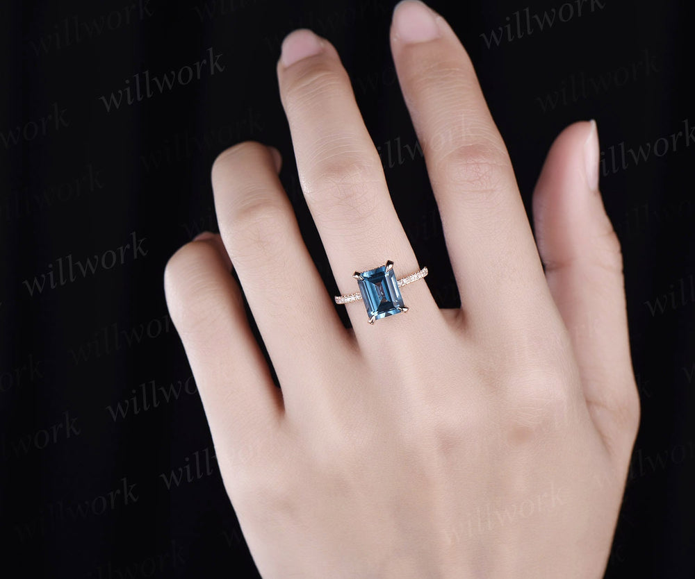 Vintage unique engagement ring under halo basket diamond ring emerald cut London blue topaz engagement ring 14k rose gold topaz ring gold