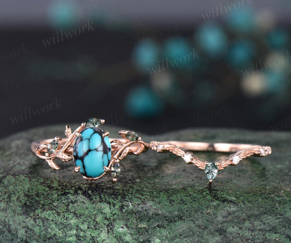 Vintage oval turquoise engagement ring set 14k rose gold art deco cluster leaf nature inspired moss agate bridal wedding ring set women