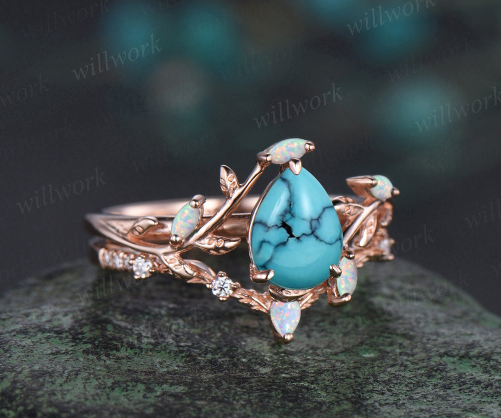 Vintage pear Turquoise engagement ring rose gold nature inspired leaf opal stacking bridal anniversary ring set women