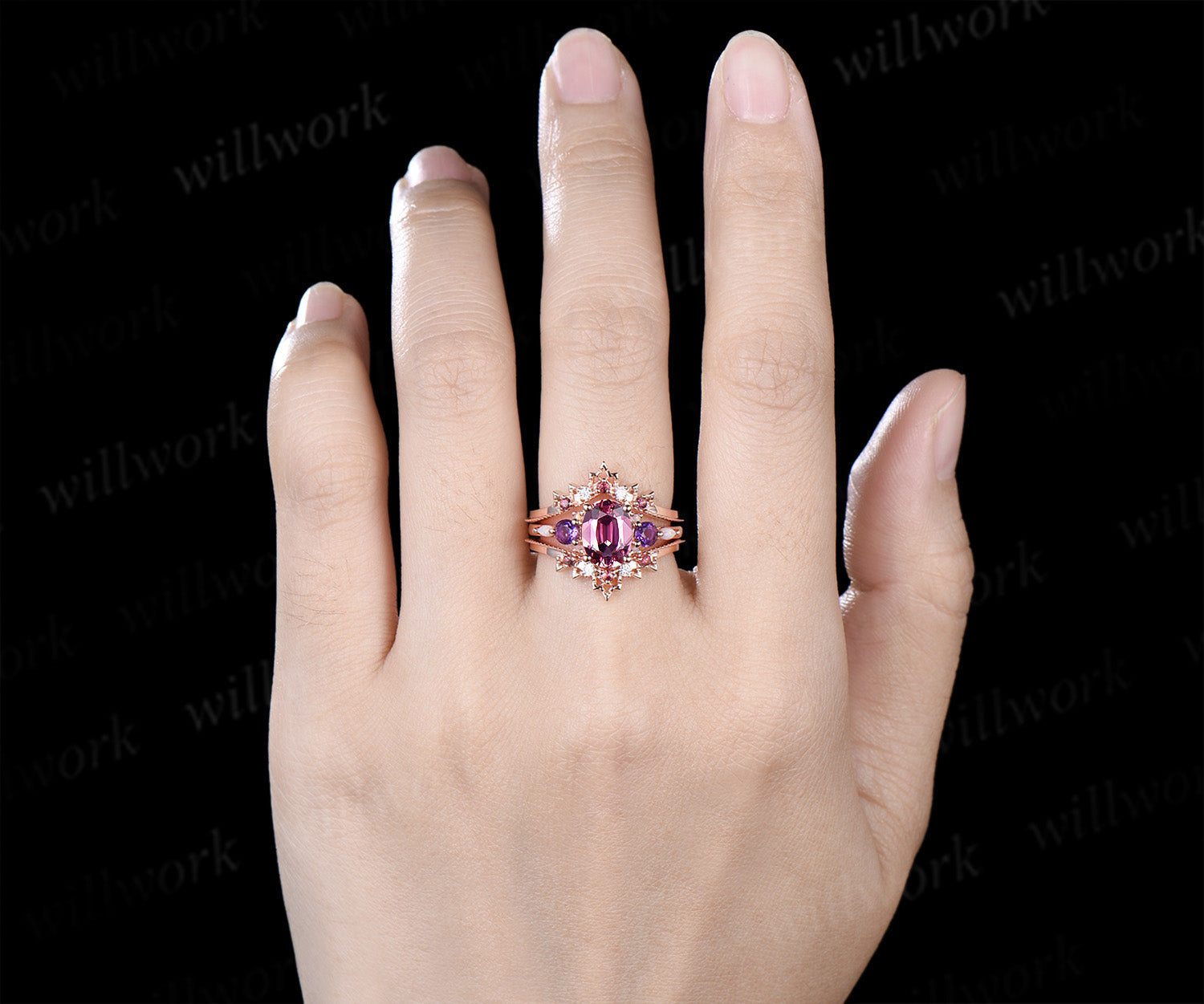 ***A luminous oval cut natural pink tourmaline glows at the center, surrounded by an arrangement of amethyst and opal. The vintage Art Deco design is paired with romantic pink tourmalines and sparkling moissanites enhancer band, creating a bridal set rich in color, elegance, and timeless charm.***- Metal: Solid gold(10K/14K/18K white/yellow/rose gold),925 sterling silver,platinum available