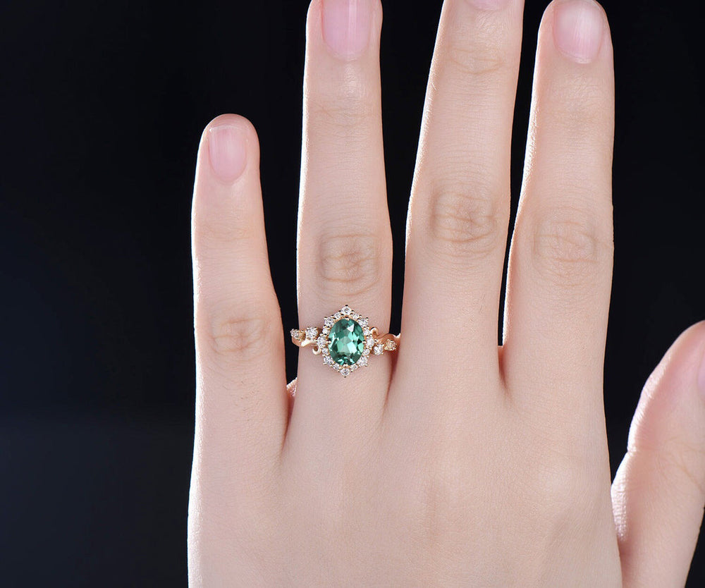Vintage oval cut teal green sapphire engagement ring 14k yellow gold halo diamond ring unique promise anniversary ring women fine jewelry