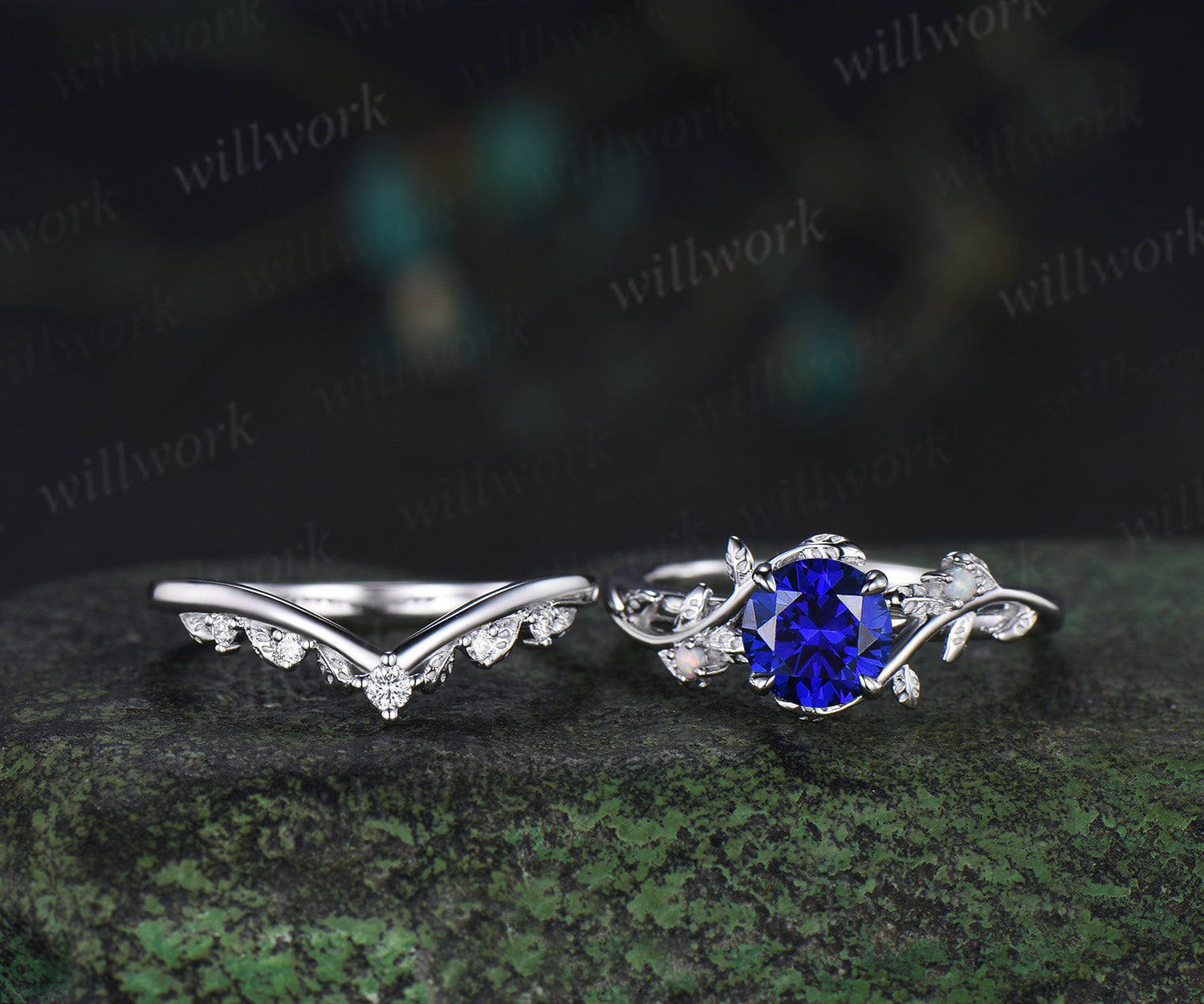 1ct round cut blue sapphire engagement ring set leaf twig opals ring moissanite wedding band brial set