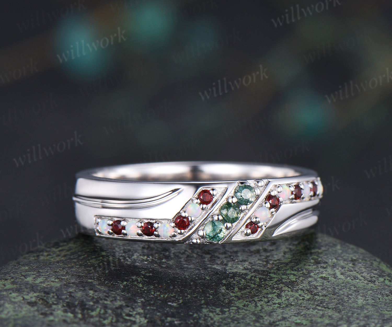 ***United by organic design, this couple ring set pairs a pear cut moss agate engagement ring with sculpted twig and leaf details alongside a 5mm men’s band accented with moss agate, opal, and garnet. Flowing lines and earthy tones create a harmonious symbol of growth, balance, and lasting connection.***