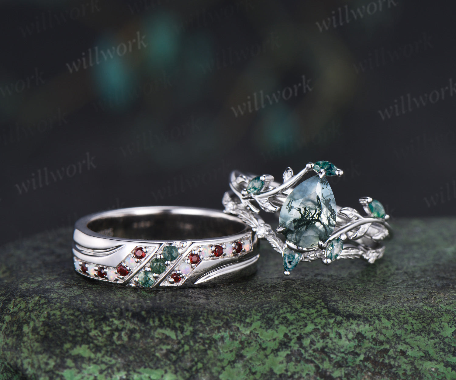 Pear Moss Agate Twig Leaf Ring Set & 5mm Moss Agate Opal Garnet Men Ring Unique Couple Ring Set