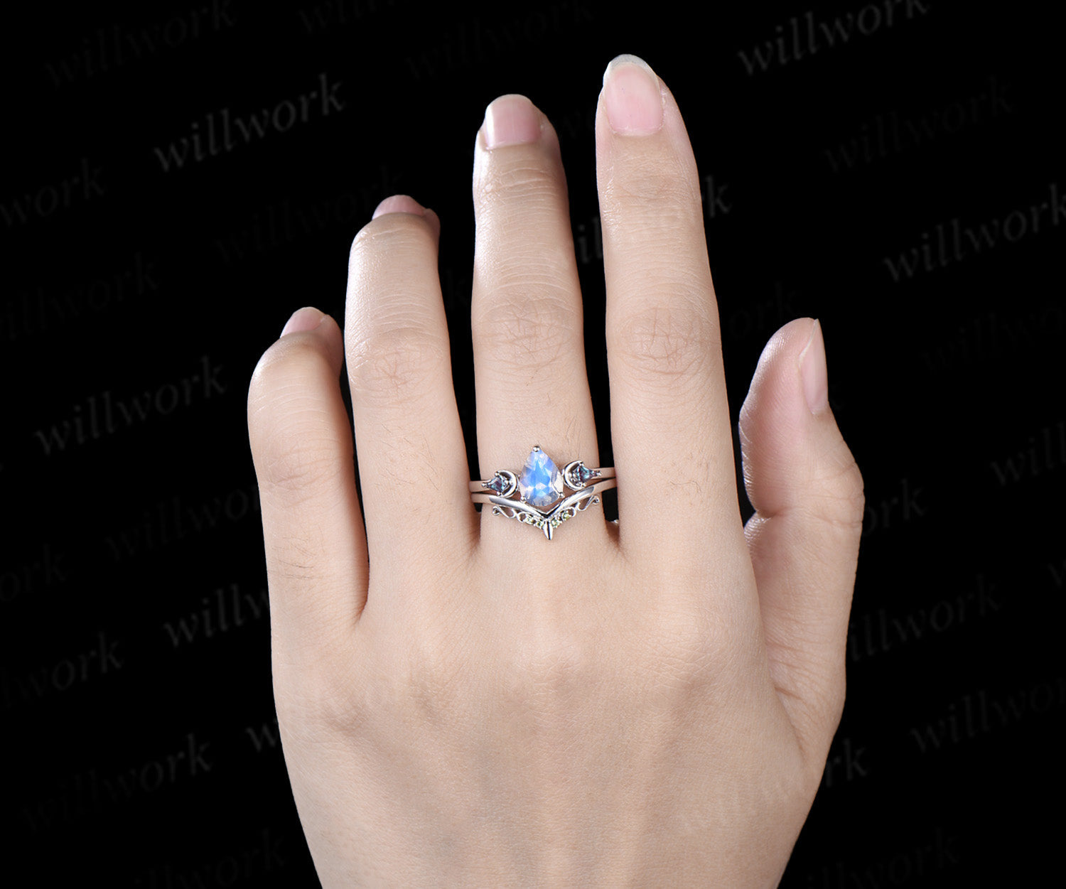Pear shape moonstone ring set kite cut alexandrite art deco moon ring matching peridot curved band vintage bridal set