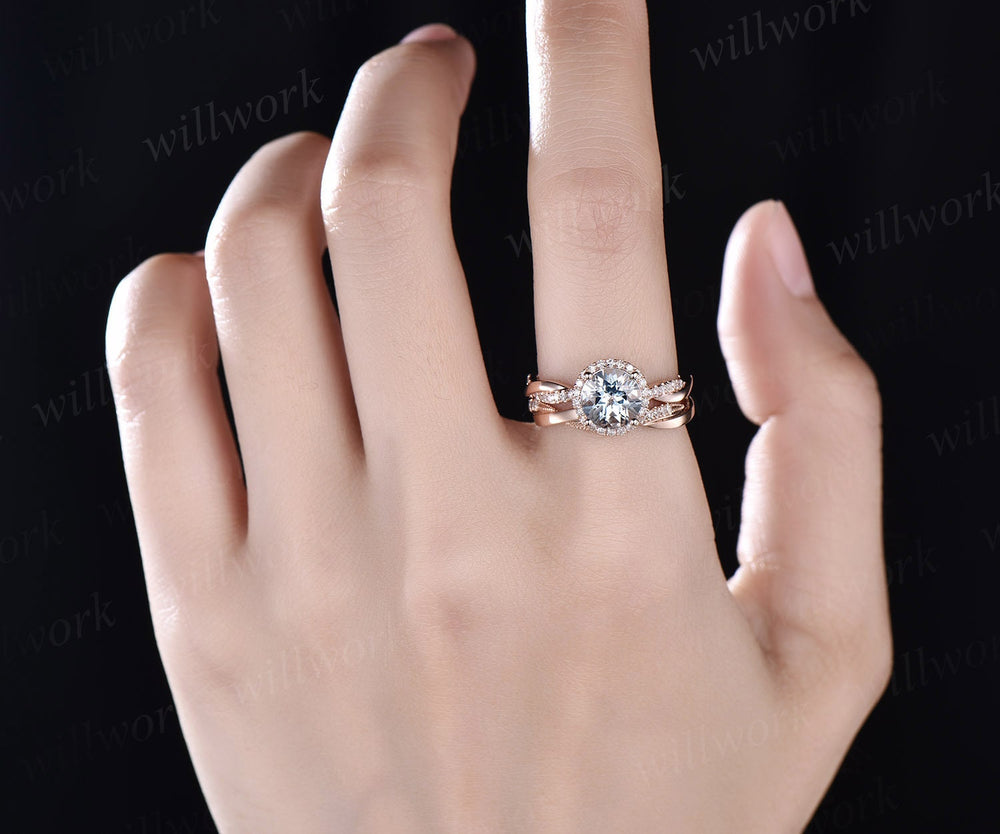 Round aquamarine bridal set rings vintage aquamarine engagement ring set full eternity diamond halo ring set March birthstone ring jewelry