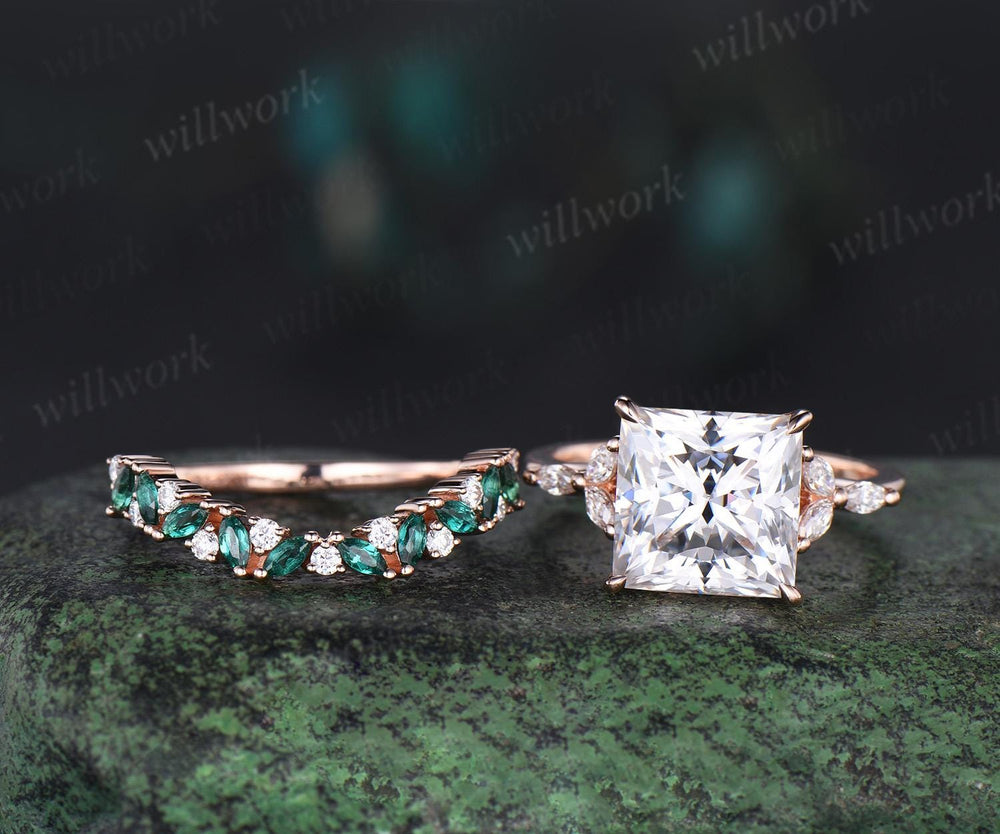 4ct princess cut moissanite engagement ring set rose gold stacking marquise emerald wedding promise ring set women jewelry