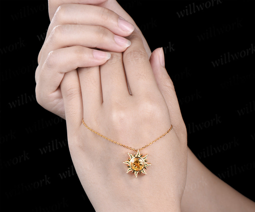 Round Cut Citrine Sun Necklace Unique 14k Yellow Gold Crystal Solitaire Pendant Dainty November Birthstone Necklace Women