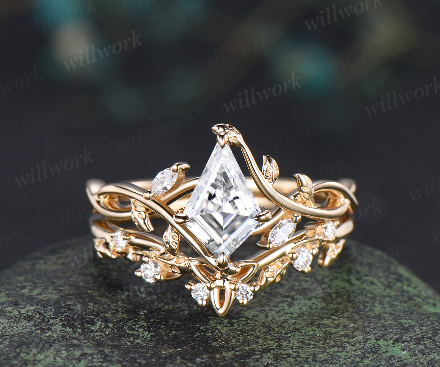 Kite cut IGI lab grown diamond infinity engagement ring set leaf twig ring Celtic Knot band promise wedding bridal set