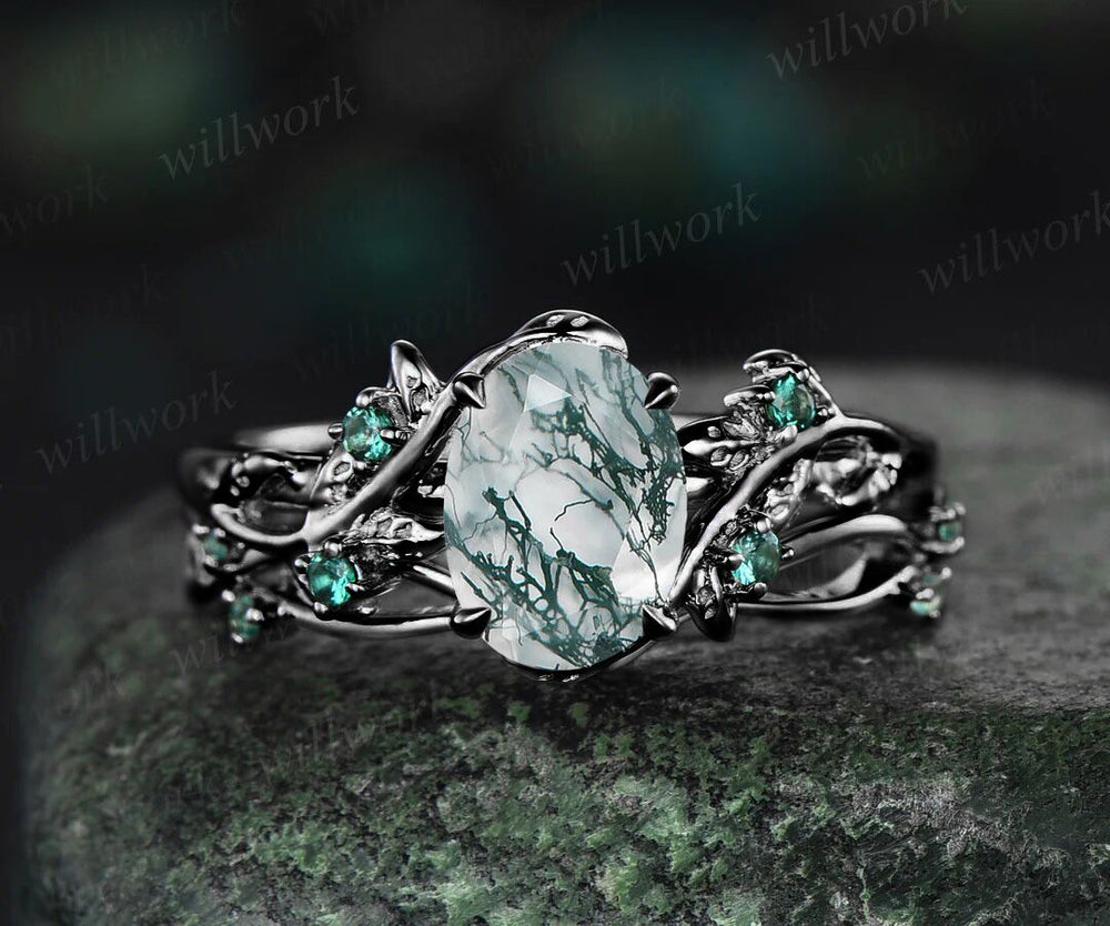 6x8mm oval cut natural moss agate nature inspired engagement ring set 14k rose gold twig leaf ring art deco emerald wedding band bridal set jewelry gifts Anniversary gift 6x8mm oval cut natural moss agate nature inspired engagement ring set 14k rose gold twig leaf ring art deco emerald wedding band bridal set jewelry gifts Anniversary gift $298.00
