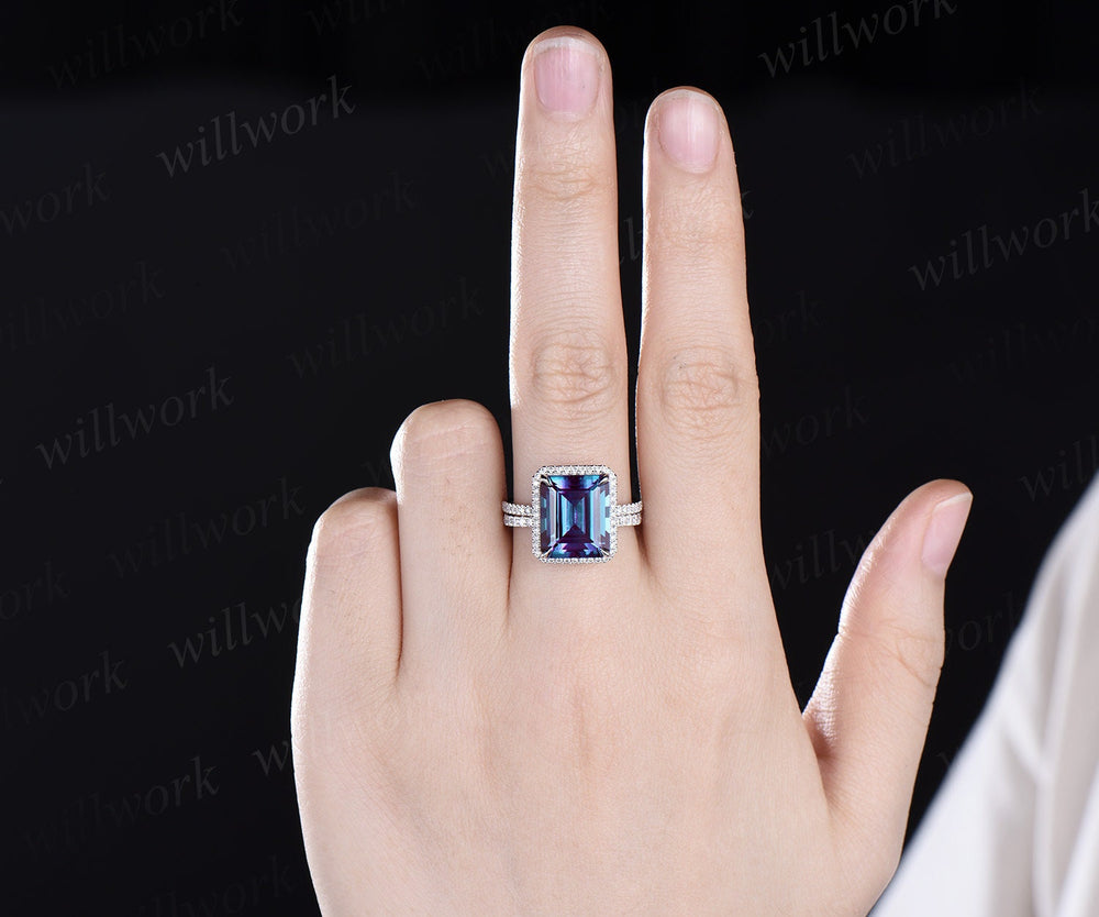 7ct emerald cut Alexandrite engagement ring solid 14k white gold half eternity halo diamond promise bridal wedding ring women jewelry
