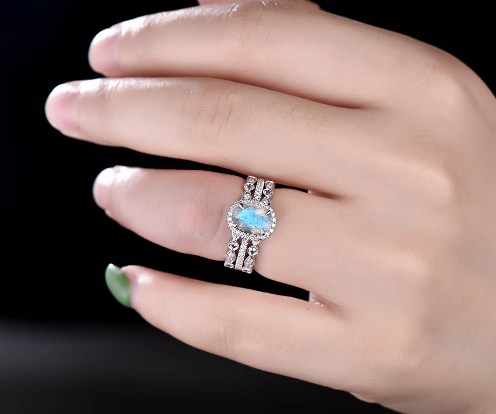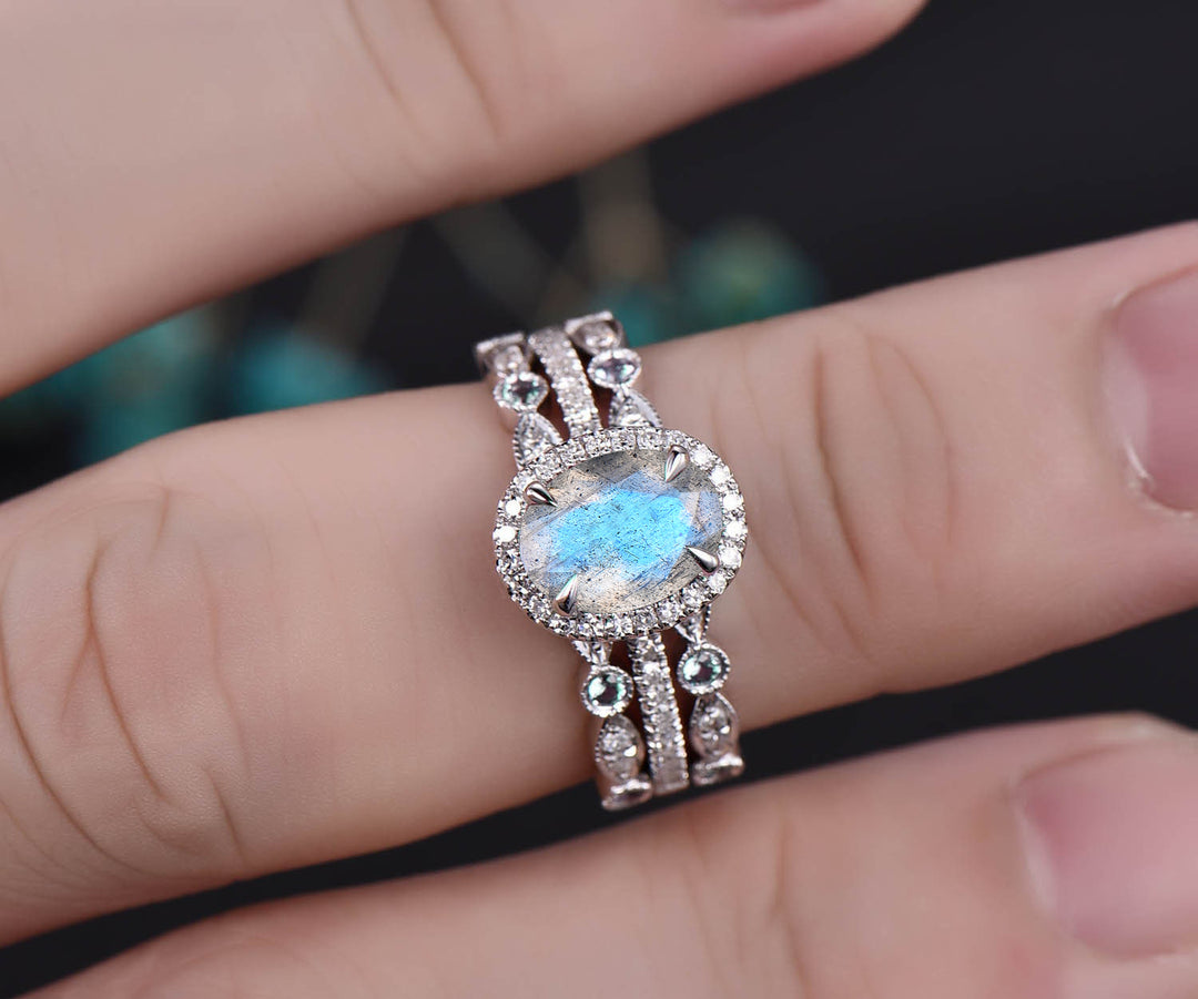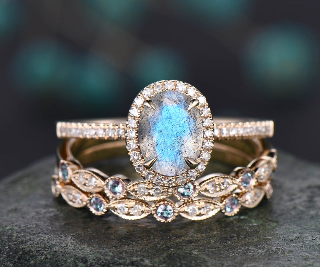 Blue labradorite engagement ring set retro halo oval cut labradorite ring milgrain art deco alexandrite diamonds half eterinty band 14k rose gold bridal ring set birthstone jewelry gifts for women