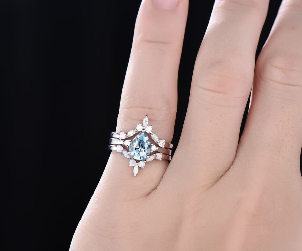 Curved marquise opal ring moissanite wedding bridal set 3pcs pear aquamarine engagement ring set rose gold March birthstone ring jewelry