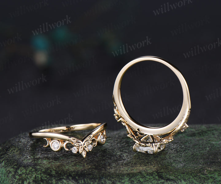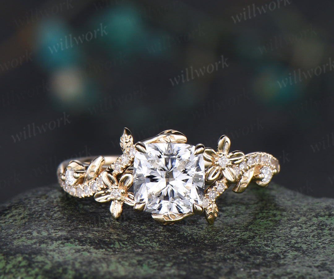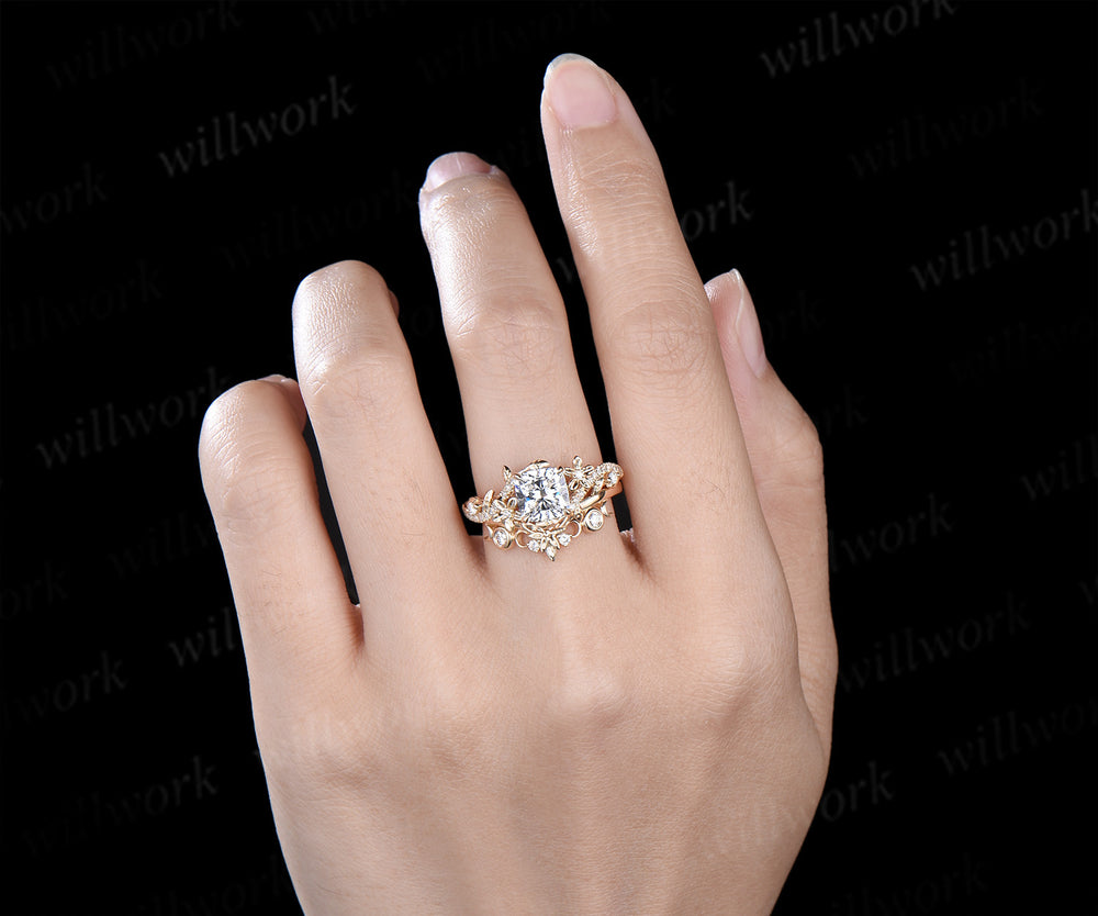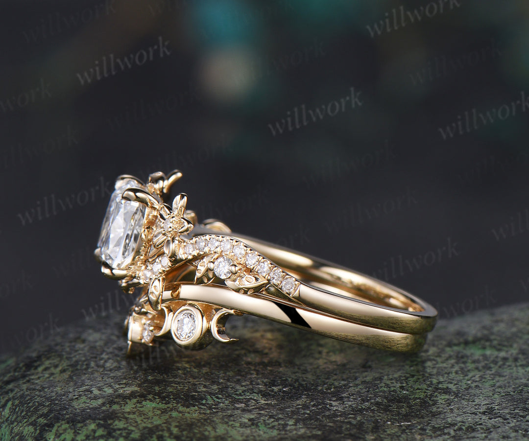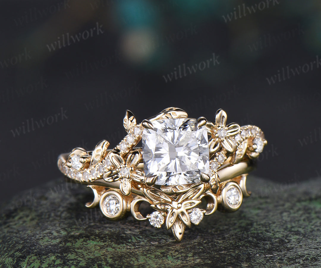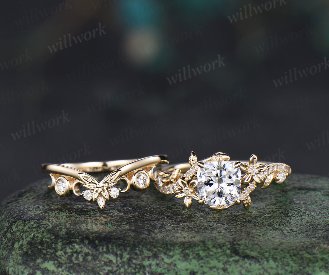 Cushion cut IGI lab grown diamond engagement ring set leaf flower twig ring unique art deco moon floral wedding band nature inspired bridal set