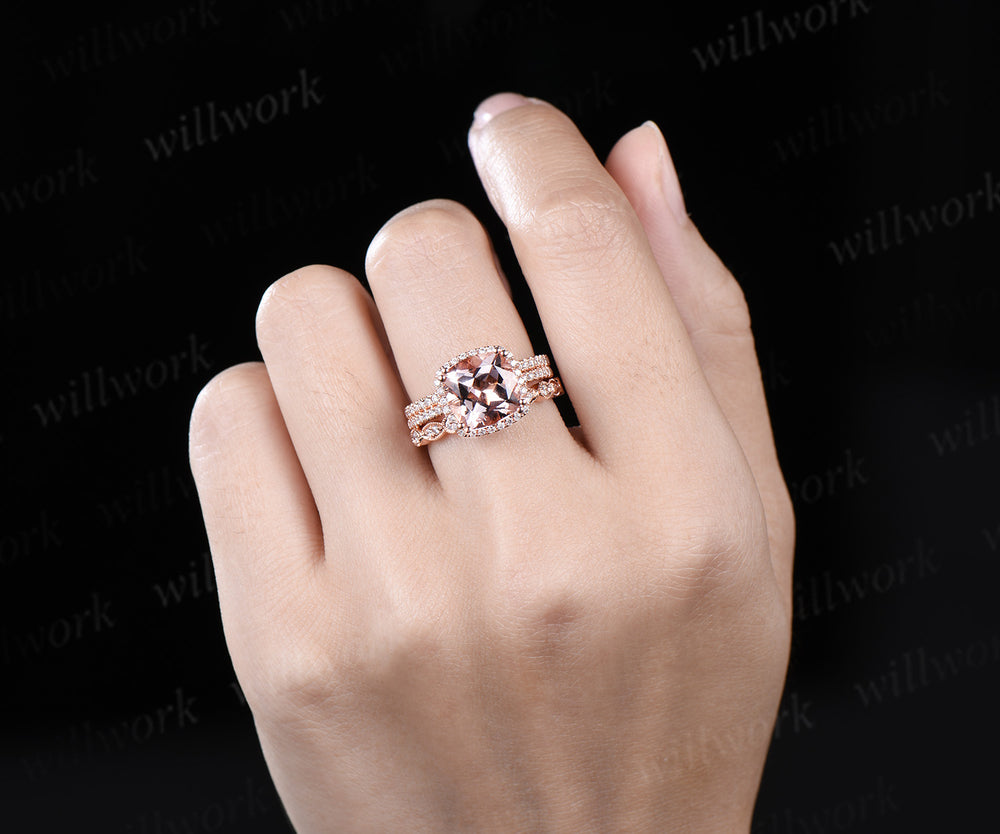 Cushion Cut Morganite Engagement Ring Set halo half eternity diamond wedding ring set rose gold art deco Milgrain bridal set jewelry