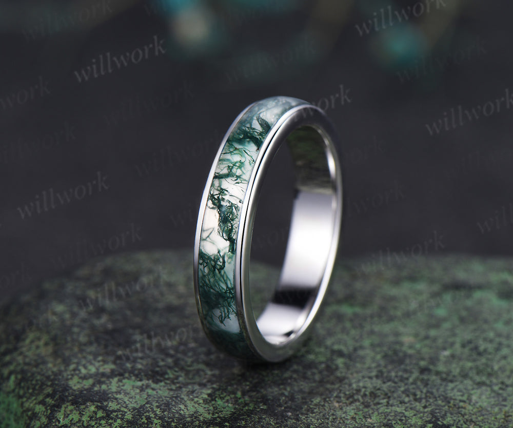 Full eternity natural moss agate wedding ring mens solid 14k 18k white gold unique wedding bridal ring women
