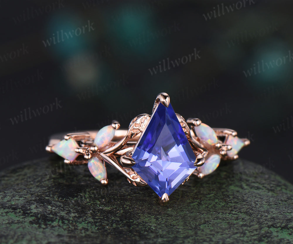 Kite cut natural Tanzanite engagement ring solid 14k 18k rose gold leaf nature inspired opal promise anniversary ring women