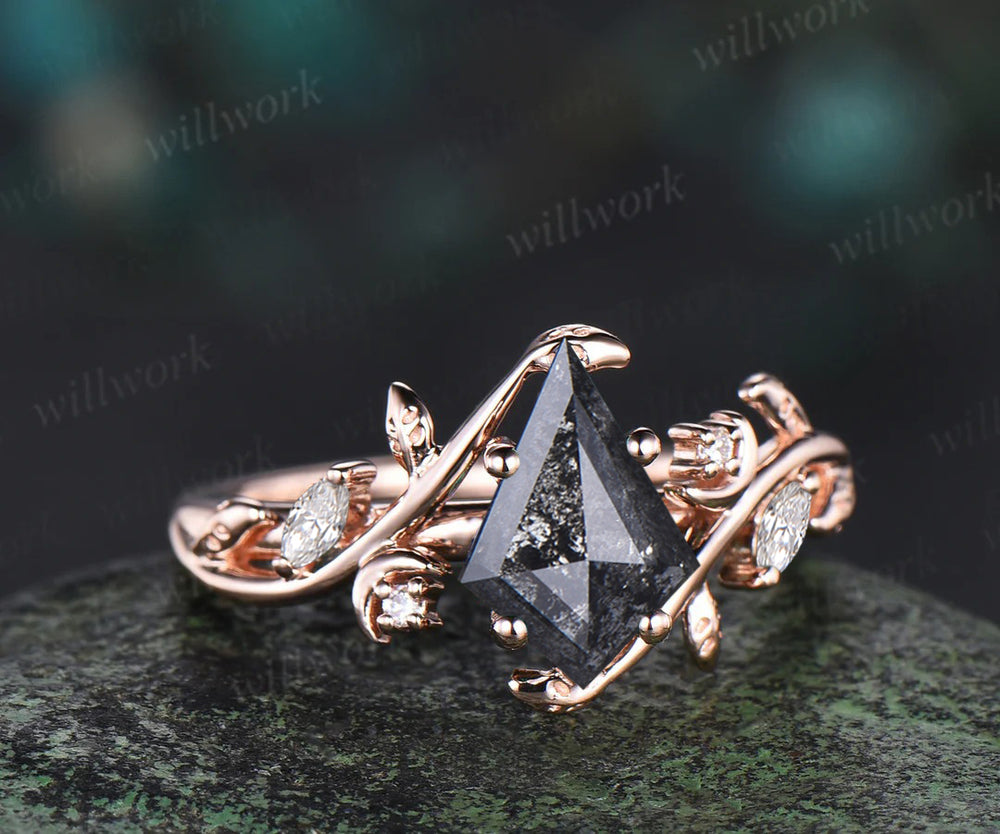 Kite cut salt and pepper diamond ring moon leaf nature inspired engagement ring diamond moissanite accented wedding ring women