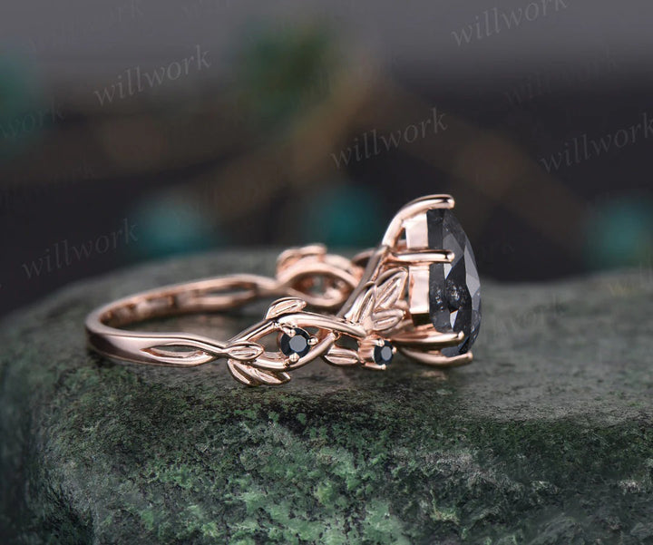 Leaf Kite Salt and Pepper Diamond Engagement Ring Nature Inspired Twig Black Diamond Accented Wedding Ring