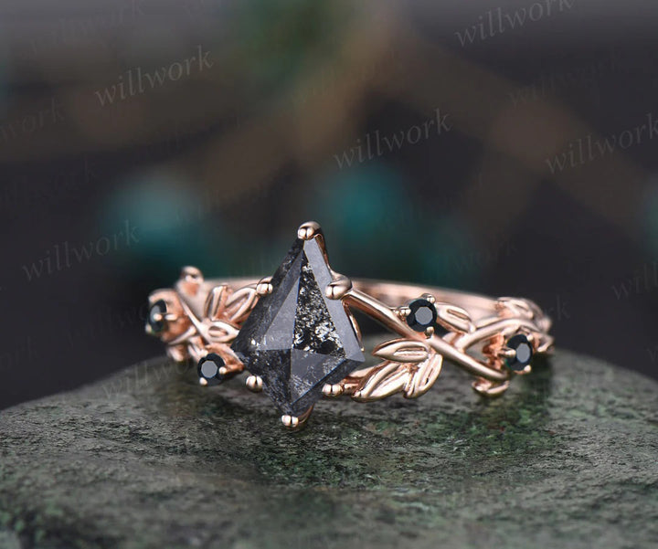 ***Discover the enchanting beauty of our Leaf Kite Salt and Pepper Diamond Engagement Ring. Handcrafted with nature-inspired elegance, this unique ring features a stunning kite-cut salt and pepper diamond, embraced by delicate twig-like branches and shimmering black diamond accents. A perfect blend of rustic charm and modern artistry, this engagement ring is ideal for brides who seek something truly one-of-a-kind. Celebrate your love with a ring as rare and raw as your story.***- Metal: Solid gold(10K/14K/18K white/yellow/rose gold), platinum available