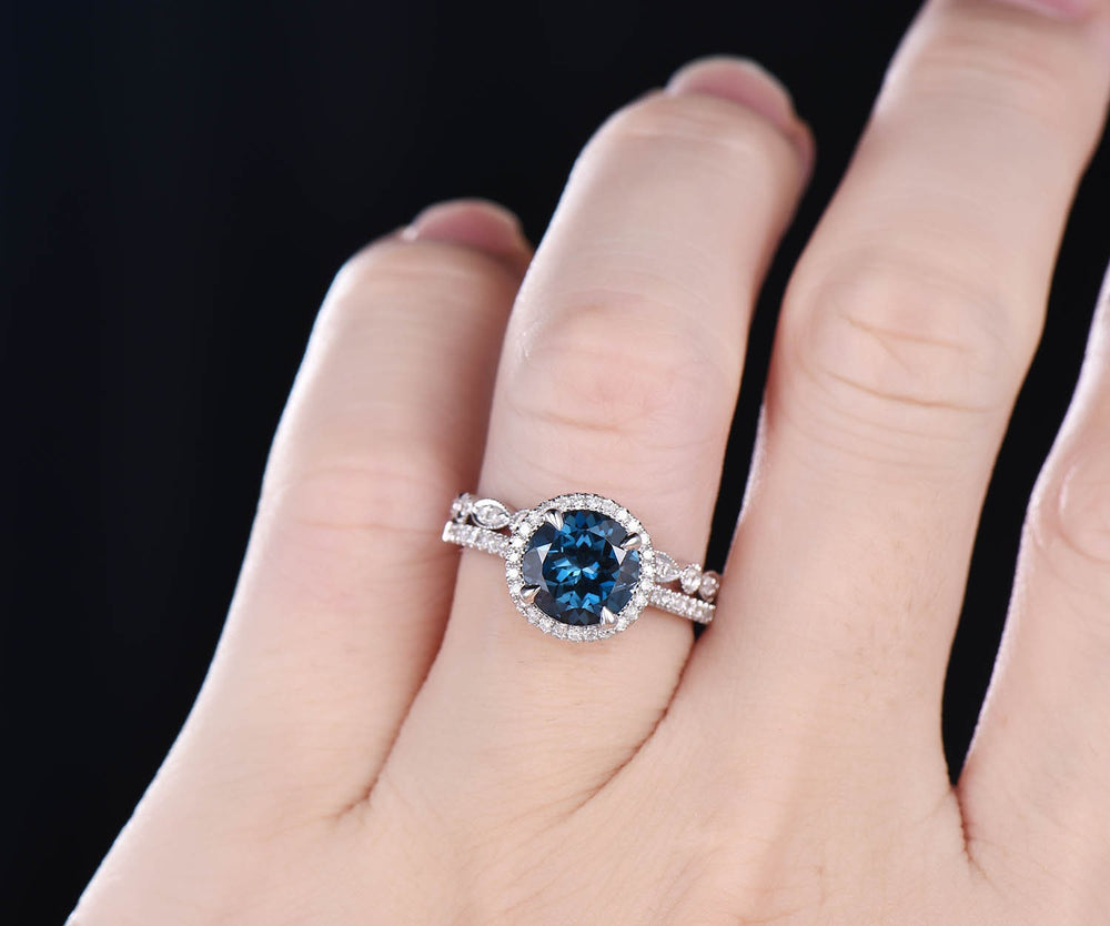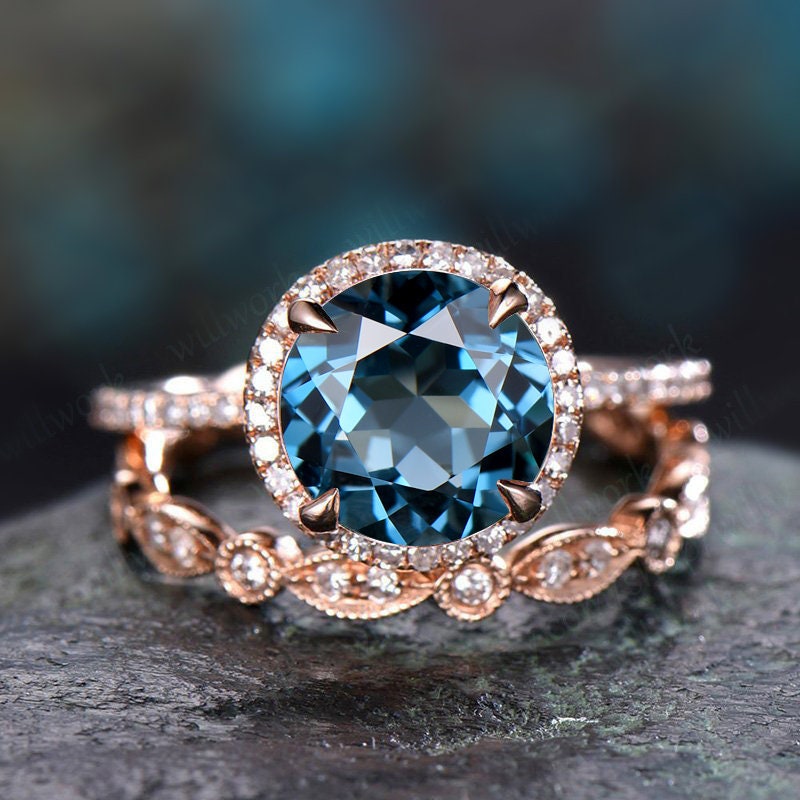 London blue topaz engagement ring set solid 14k rose gold diamond halo ring art deco full eternity matching wedding ring band 2pcs jewelry