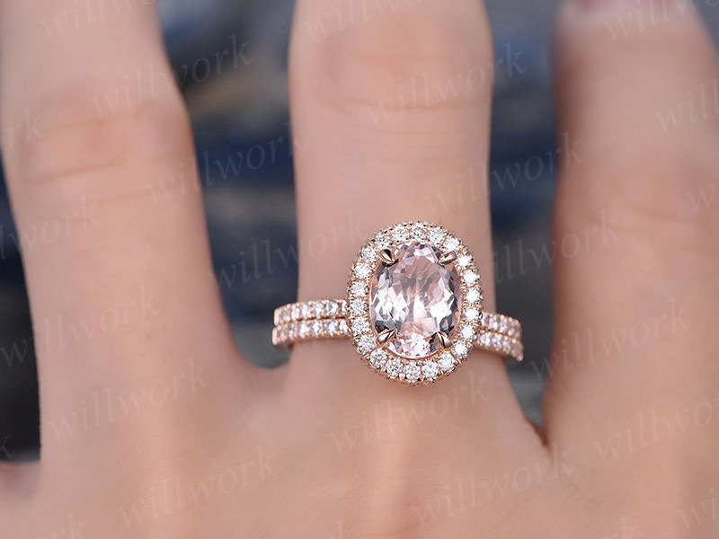 Morganite engagement ring set-handmade Solid 14k Rose gold ring-Real Diamond band-6x8mm Oval gemstone Halo Moissanite ring-Bridal Ring set