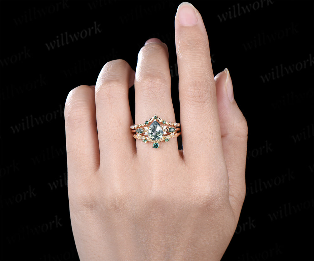 Nature inspired pear moss agate ring set marquise moss agate seven stone ring art deco emerald moissanites wedding band unique bridal set