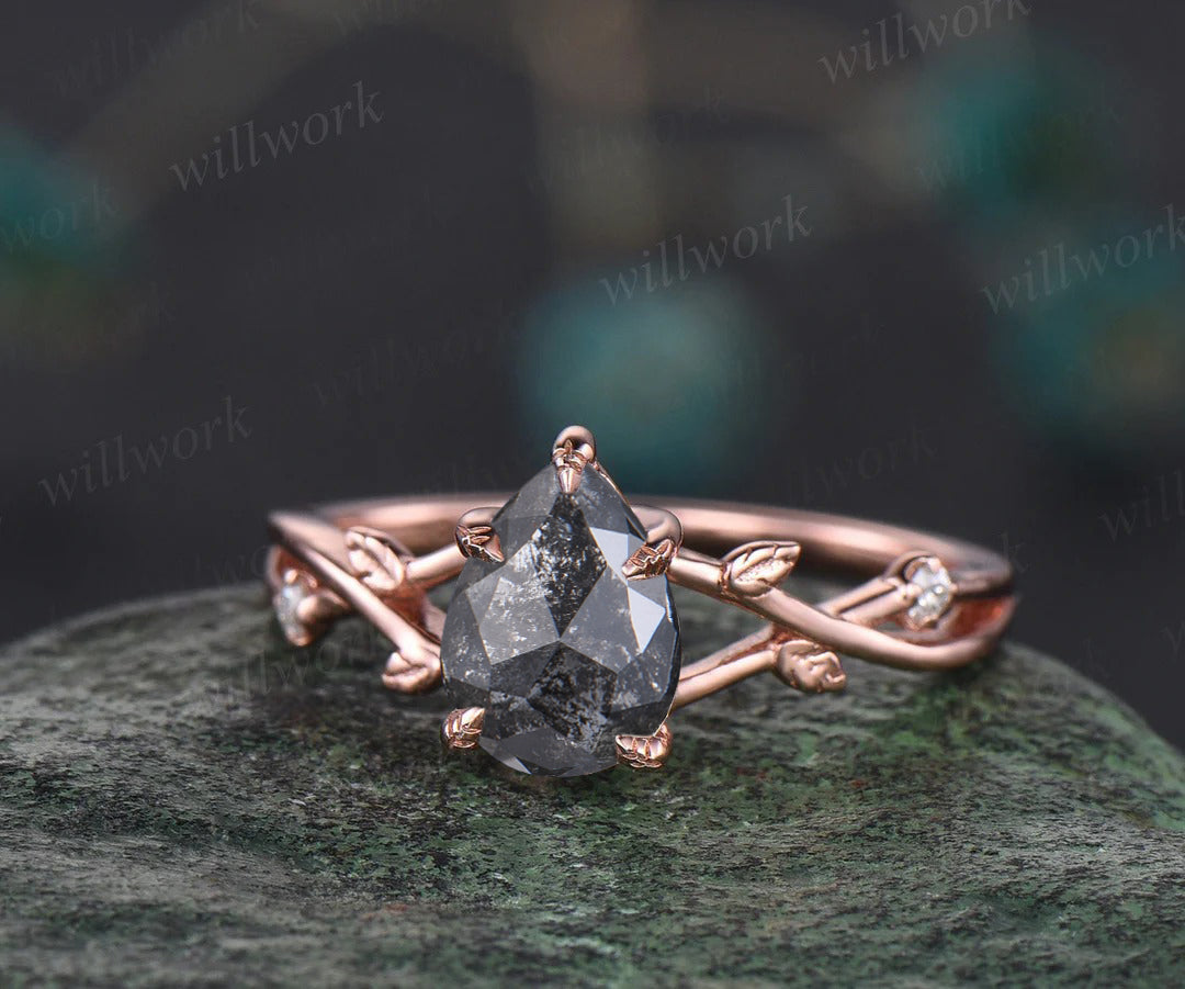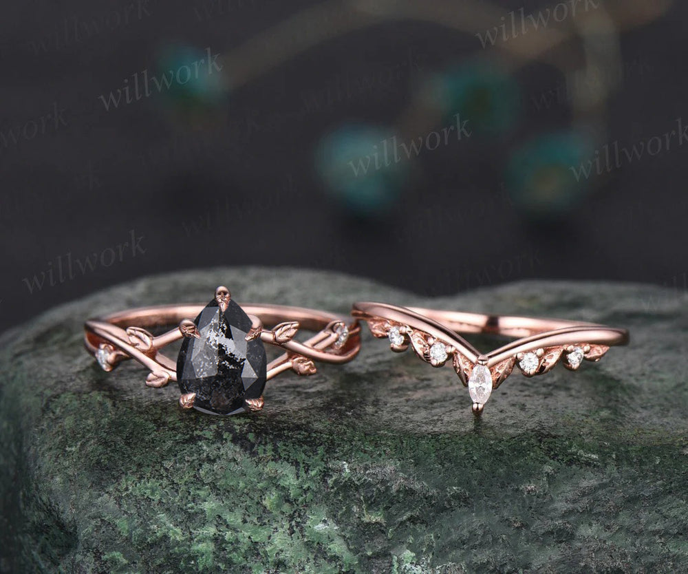 Nature Inspired Pear Salt and Pepper Diamond Engagement Ring Twised Twig Leaf Unique Diamond Bridal Wedding Ring Set Women Gift