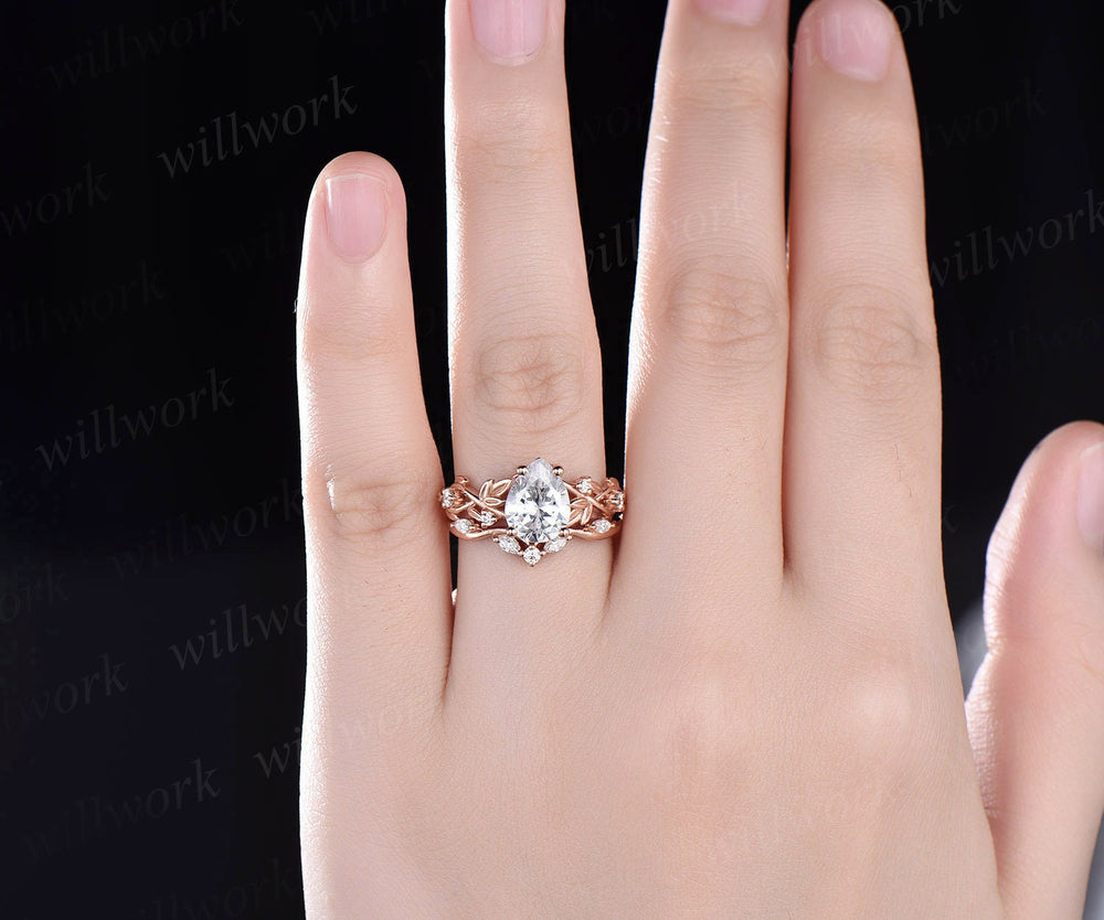 ***Embrace natural elegance with this pear-shaped lab-grown diamond engagement ring set for women. Featuring a rose gold twig band with five stone diamond accents and delicate leaf branch details, this nature-inspired wedding ring set is a romantic, eco-friendly choice for unique bridal jewelry.***- Metal: Solid gold(10K/14K/18K white/yellow/rose gold), platinum available
