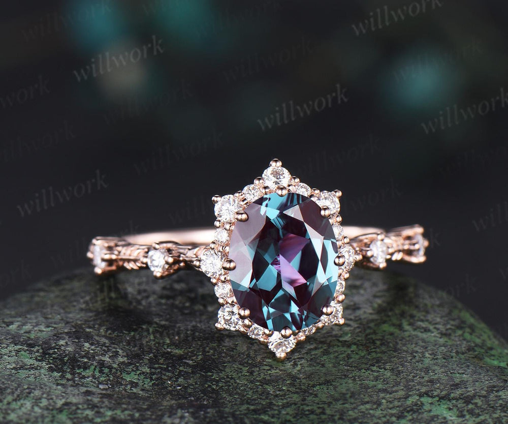 Oval cut Alexandrite snowdrift halo engagement ring leaf half eternity diamond promise ring 14k rose gold unique wedding ring women Oval cut Alexandrite snowdrift halo engagement ring leaf half eternity diamond promise ring 14k rose gold unique wedding ring women $1,363.00