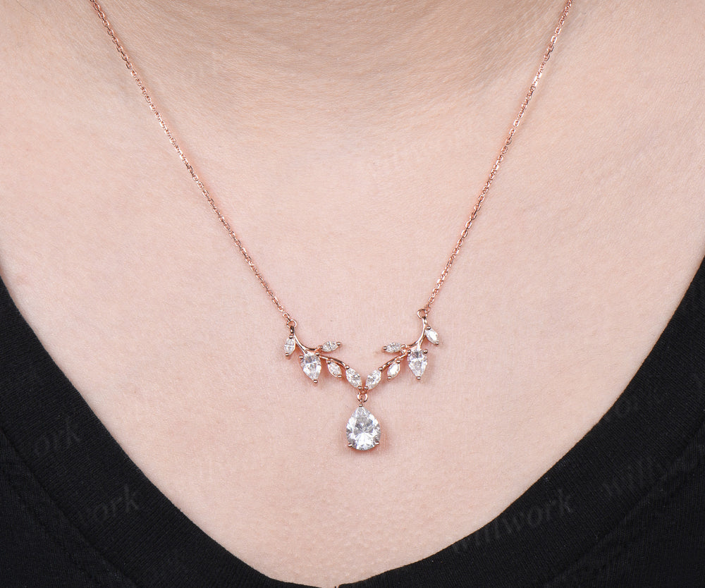 Pear moissanite leaf necklace nature inspired marquise moissanite twig pendant rose gold unique wedding anniversary gifts
