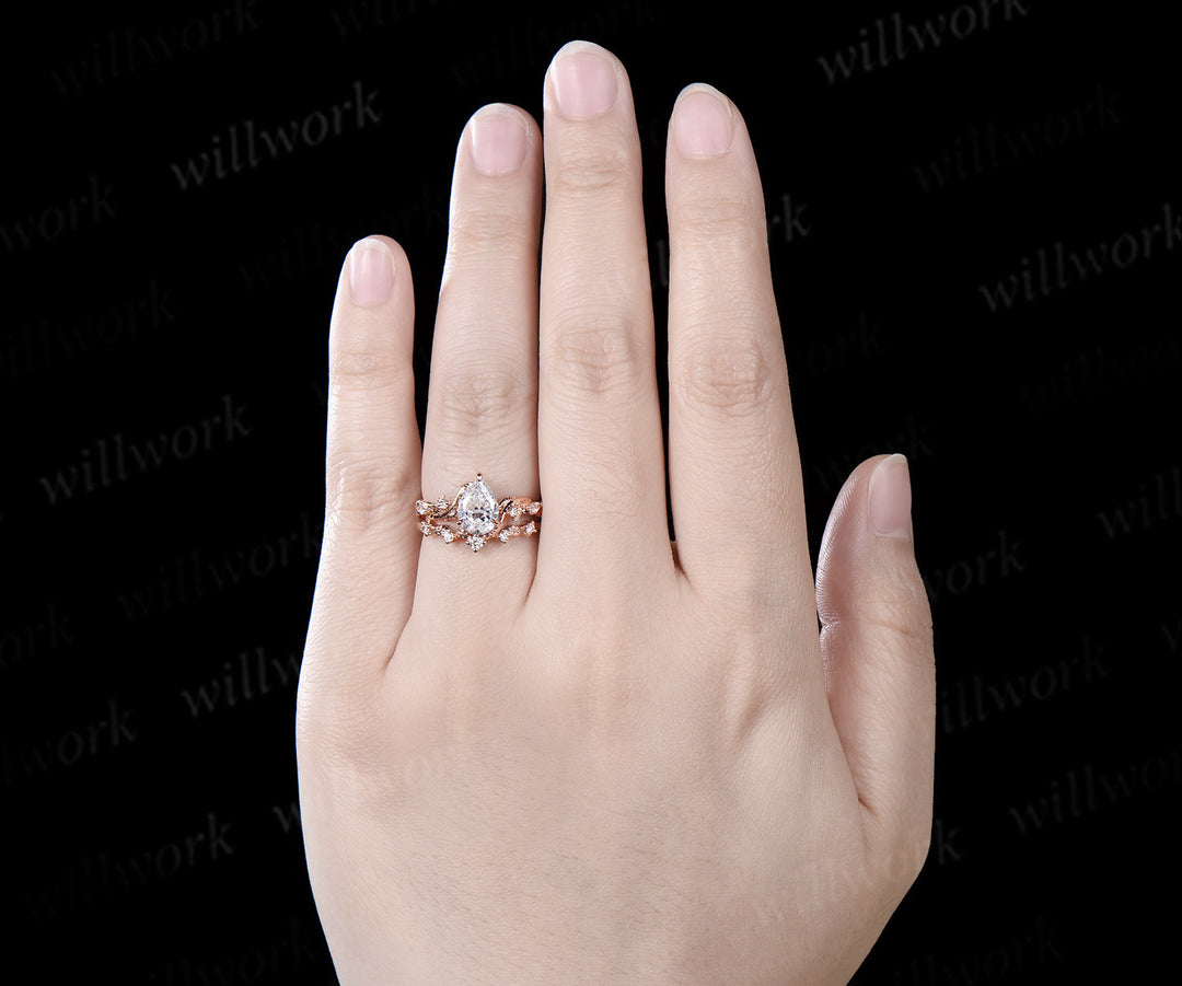 Pear shaped IGI Lab grown diamond engagement ring set rose gold branch leaf ring set antique promise wedding ring set women