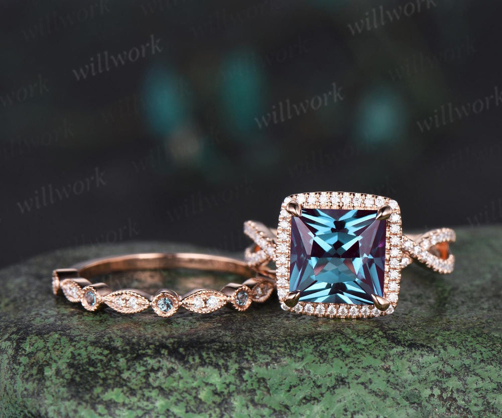 Princess cut Alexandrite engagement ring set cushion halo infinity half eternity diamond wedding bridal ring set women 14k rose gold jewelry