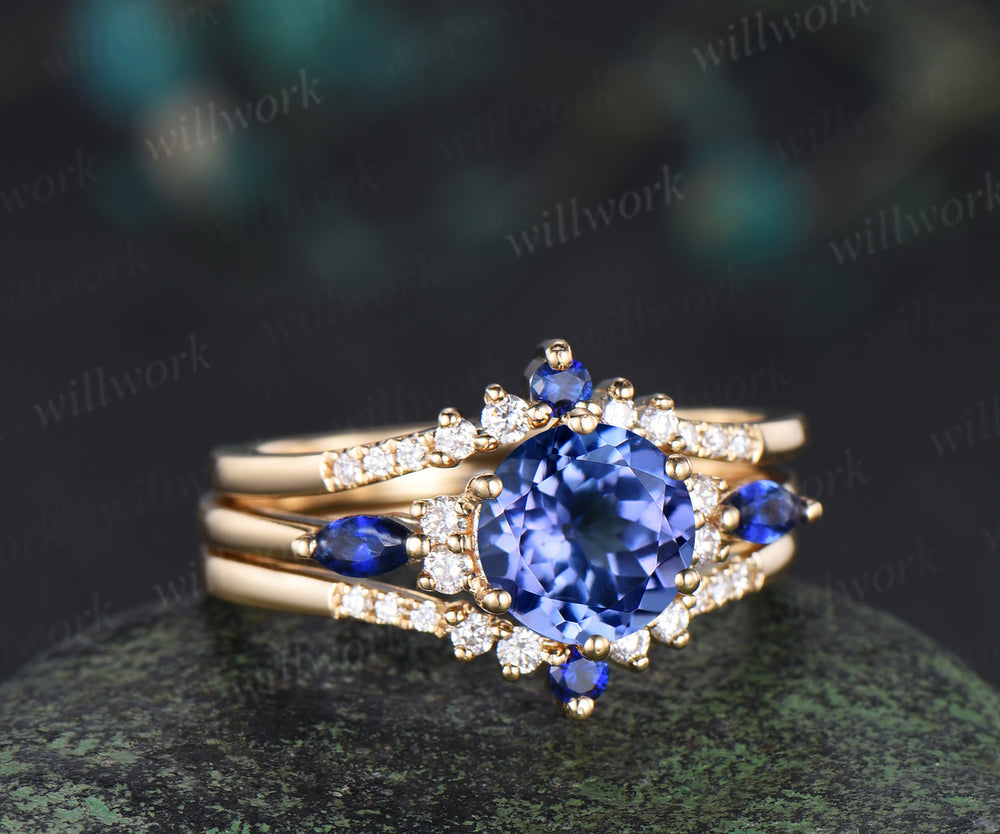 Round cut natural tanzanite engagement ring set yellow gold sapphire diamond wedding ring set jewelry
