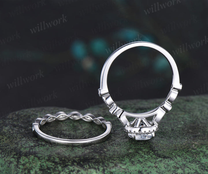 Round IGI Lab Grown Diamond Halo Engagement Ring Set Half Eternity Bridal Wedding Ring Set