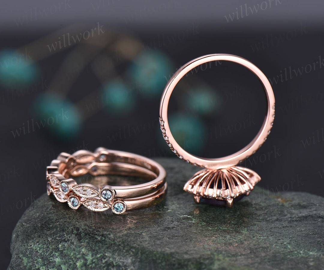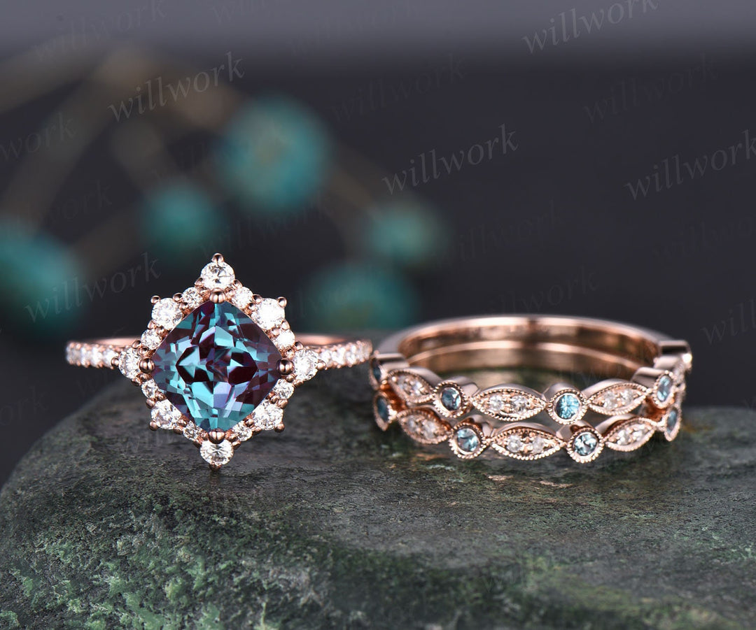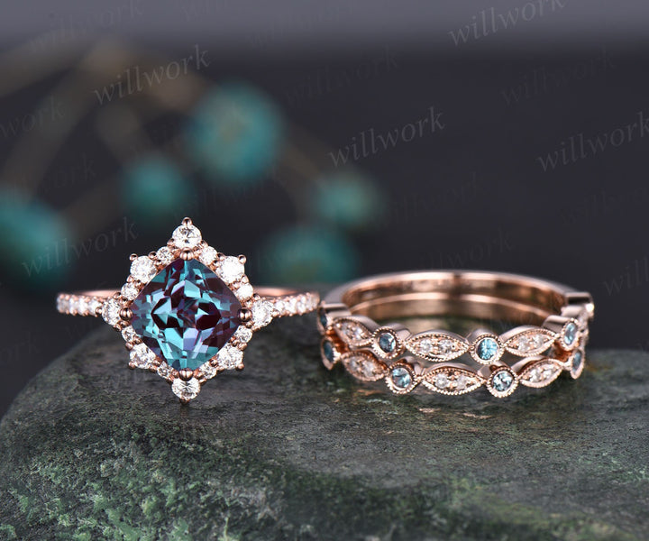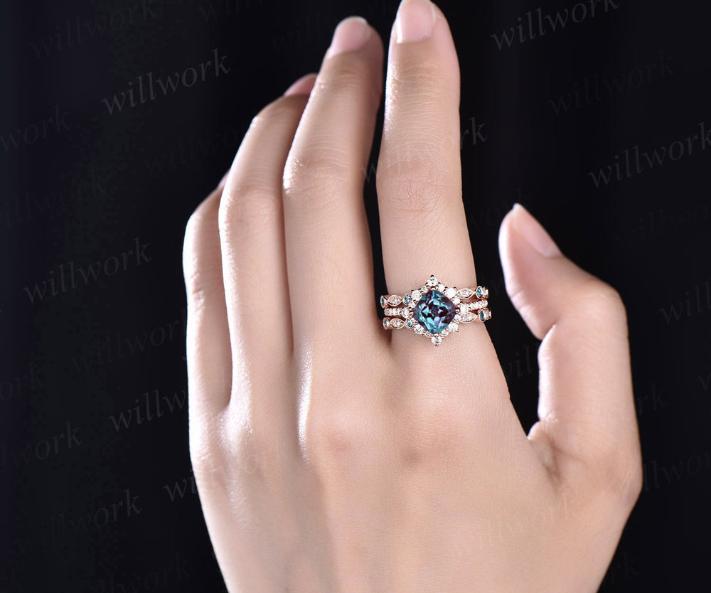 Unique engagement ring set cushion cut Alexandrite engagement ring set diamond ring set cluster halo ring women jewelry June birthstone ring