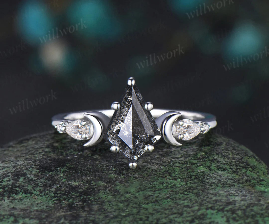 ***Celebrate the magic of individuality with this unique kite cut salt and pepper diamond engagement ring set. The celestial-inspired design features a mesmerizing kite-shaped center diamond, held securely by six prongs and framed by sparkling accent diamonds. A delicate moon-themed band completes the set, symbolizing eternal love and feminine strength. Handcrafted with care, this bridal ring set is perfect for the modern woman who dares to be different and embraces the beauty of imperfection.***- Metal: Solid gold(10K/14K/18K white/yellow/rose gold), platinum available