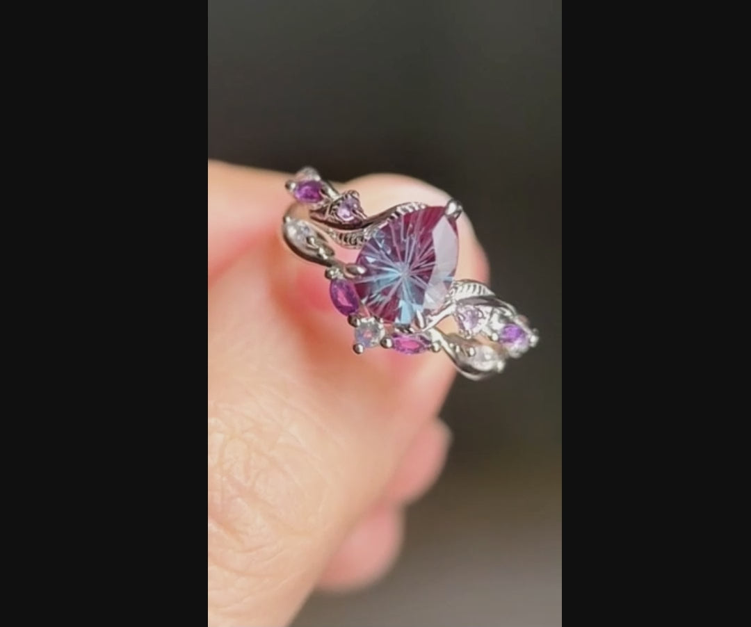 Fireworks cut Alexandrite ring white gold nature inspired bridal ring set leaf amethyst moonstone band gifts for her