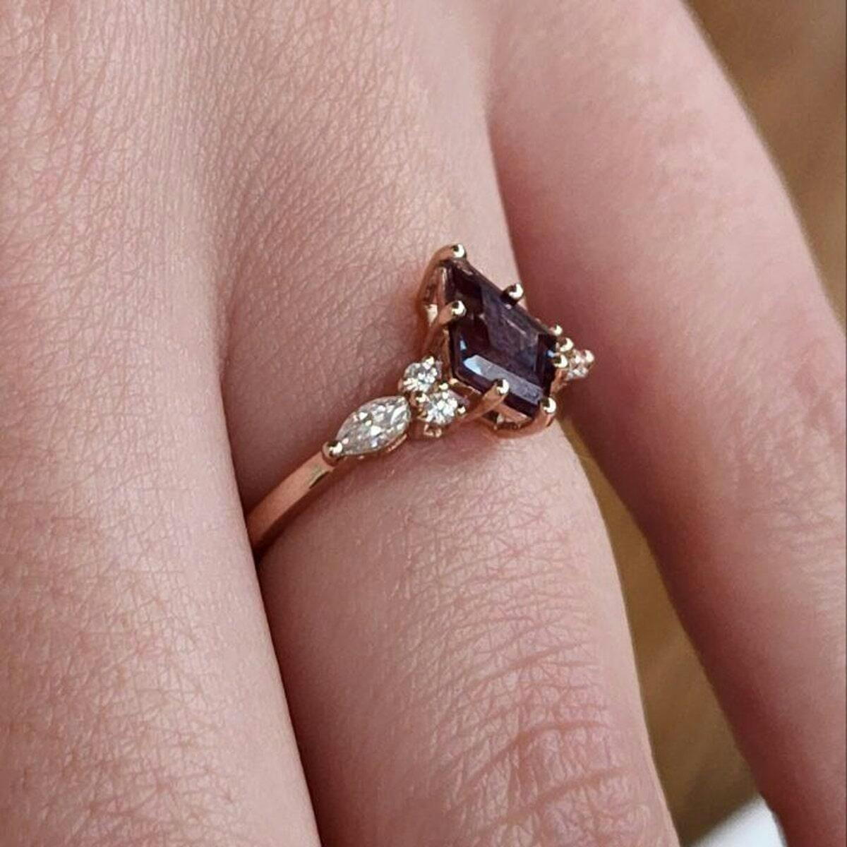 Kite cut alexandrite engagement ring 14k rose gold leaf nature inspired cluster diamond wedding band enhancer unique wedding ring set women