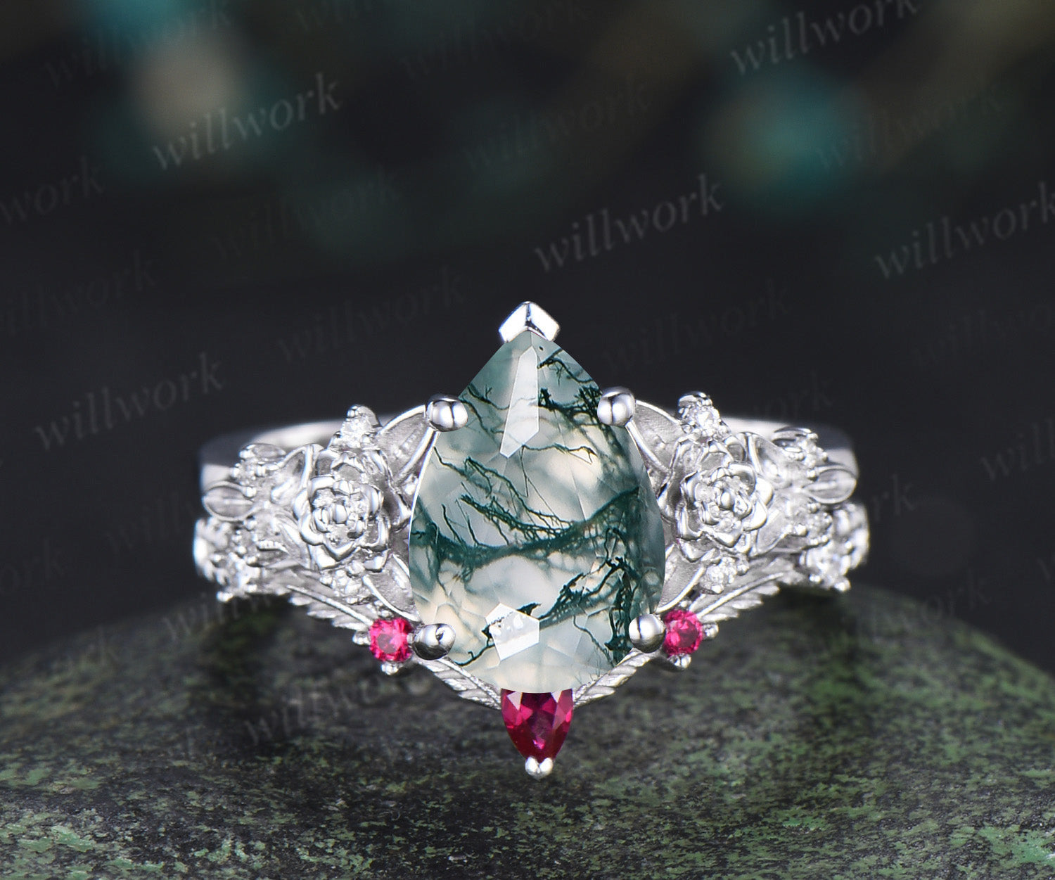 Succulent inspired pear moss agate engagement ring set moissanites rubies leaf wedding ring bridal set