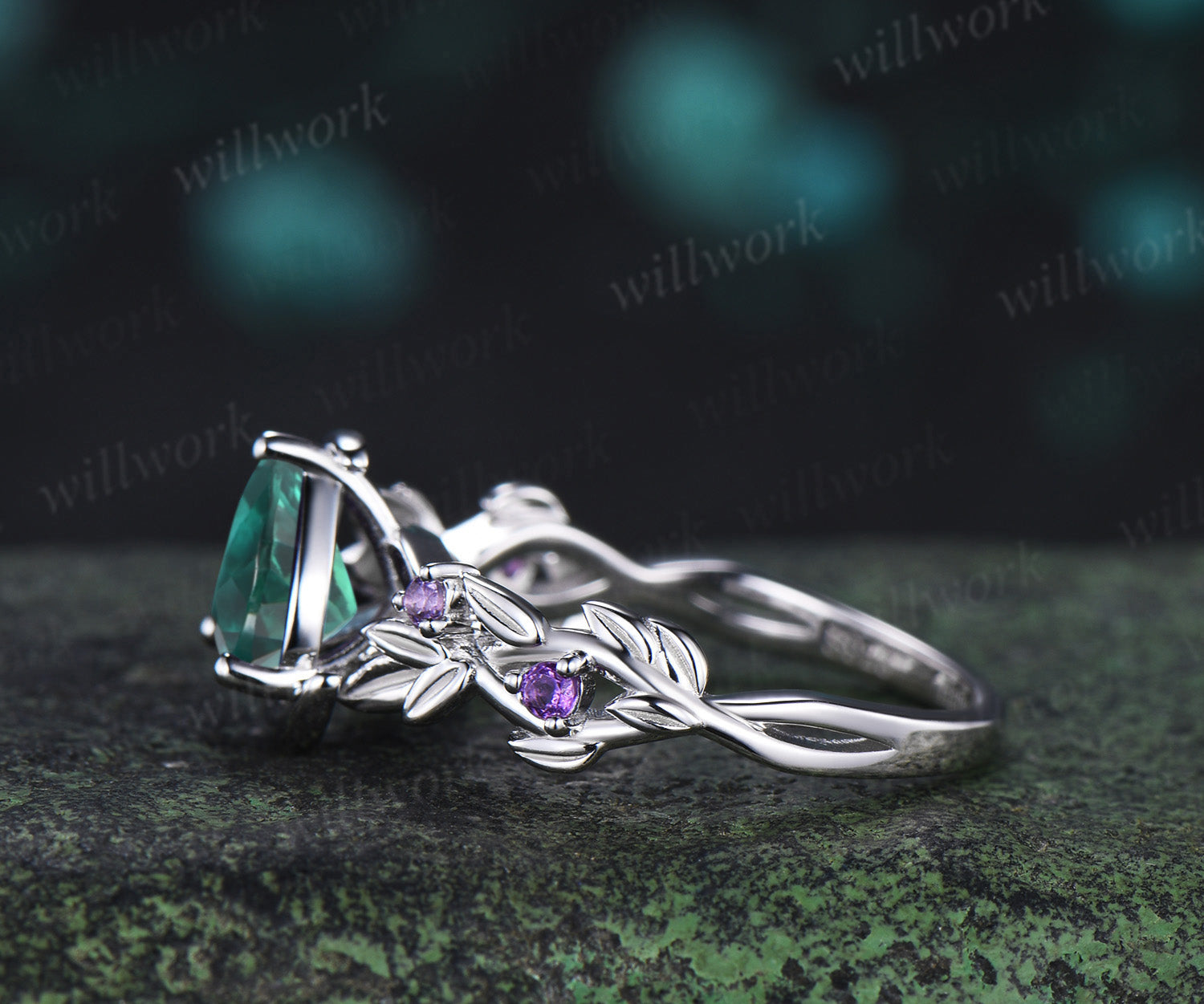 Unique trillion cut emerald engagement ring star leaf twig amethyst accent five stones promise ring
