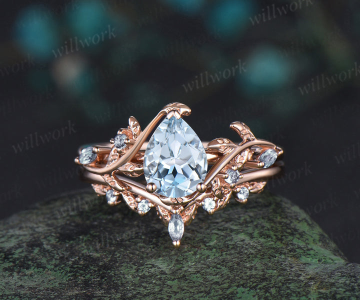 Pear shaped aquamarine engagement ring set rose gold leaf branch March birthstone wedding promise ring set women jewelry