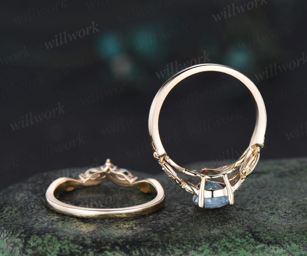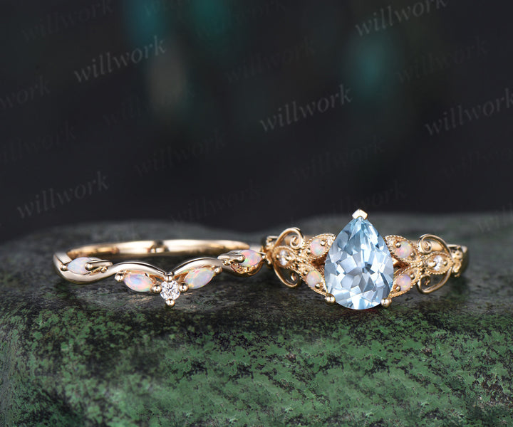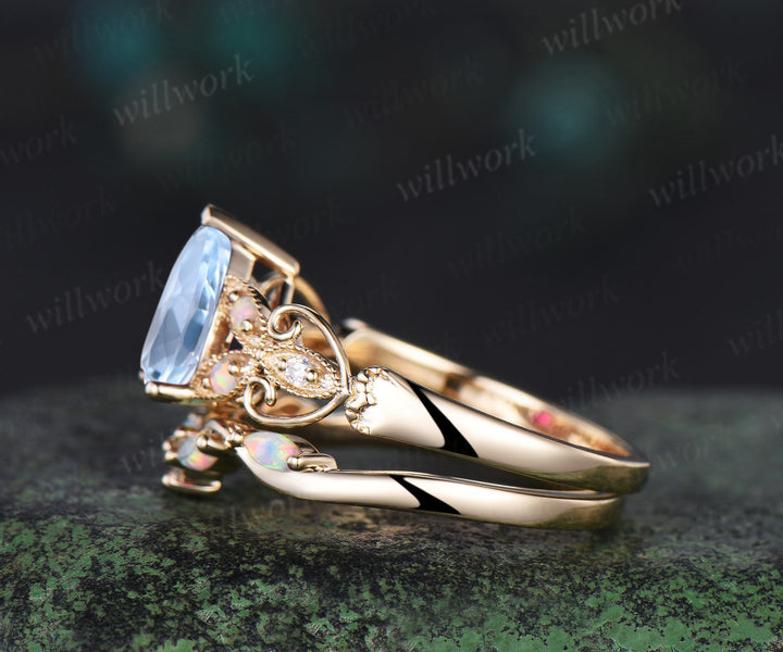 Pear shaped aquamarine ring 14k yellow gold opal butterfly Milgrain engagement ring set women art deco unique bridal ring set
