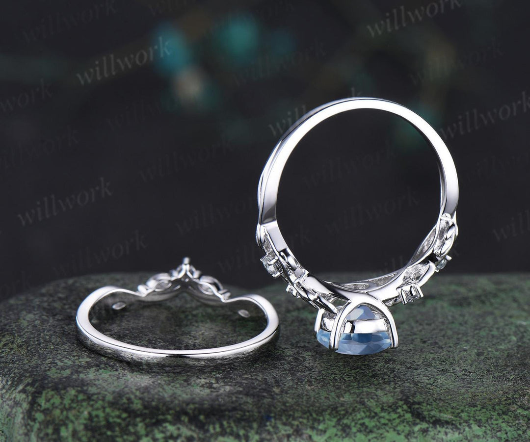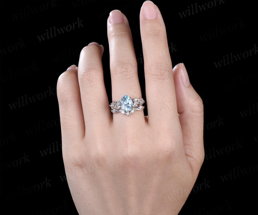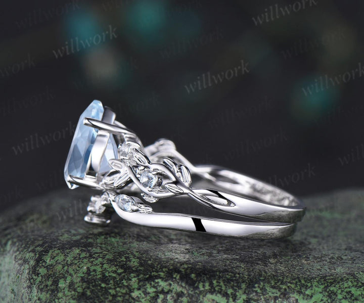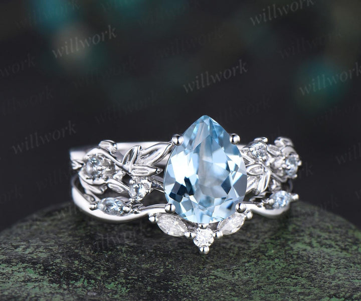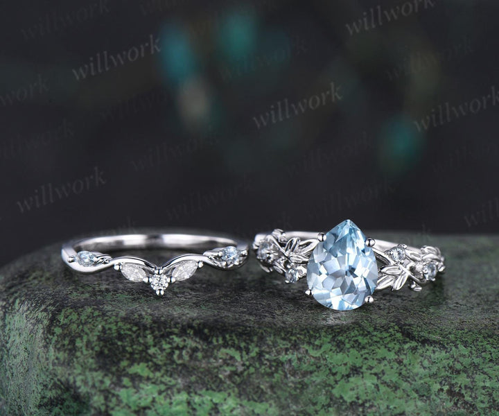 Pear shaped Aquamarine ring leaf infinity nature inspired engagement ring set 18k white gold stackable promise wedding ring set jewelry