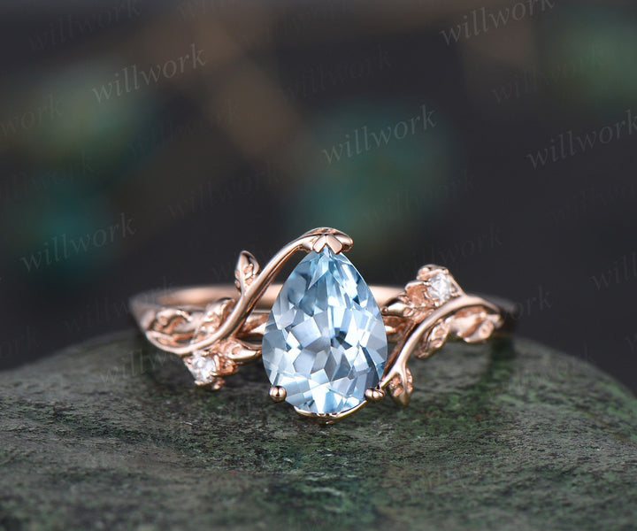 Pear shaped natural aquamarine ring rose gold leaf nature inspired unique engagement ring women antique promise wedding bridal ring set gift