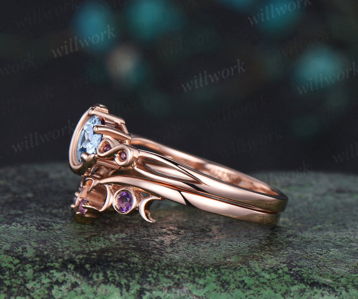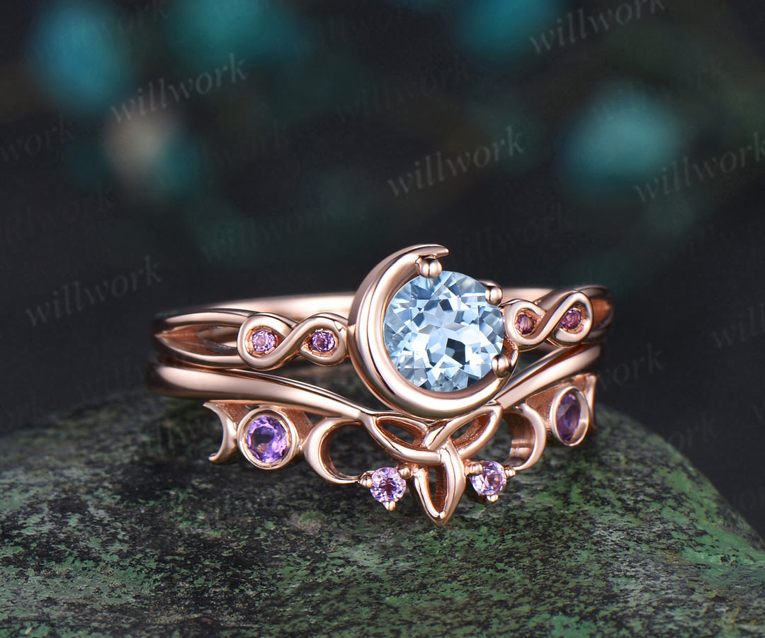 Round cut aquamarine engagement ring rose gold moon infinity five stone amethyst wedding ring set women Norse Viking Jewelry