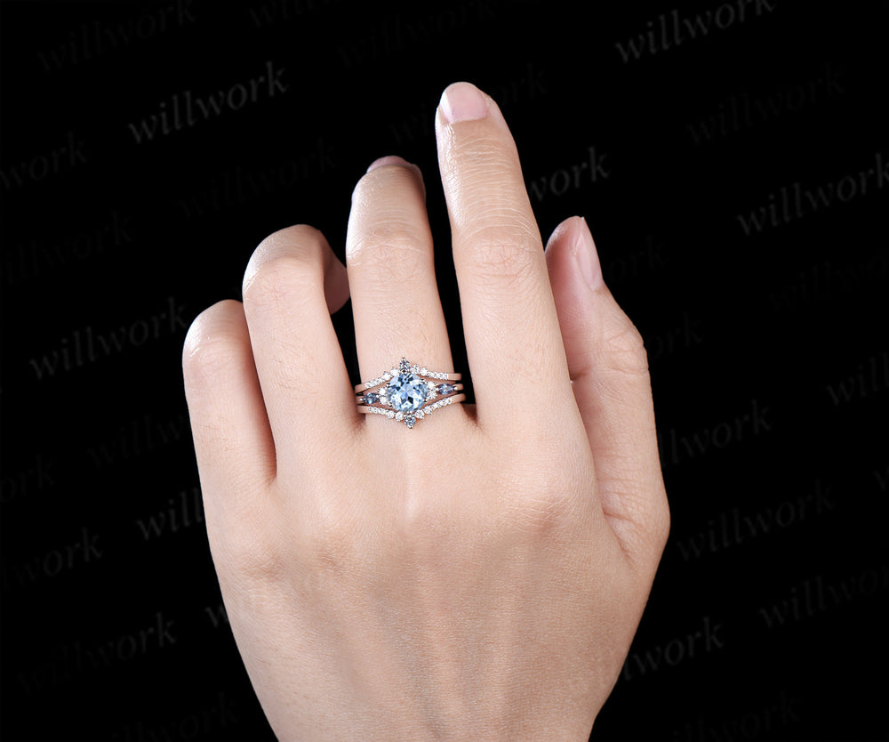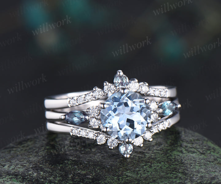 Round cut natural aquamarine engagement ring set marquise alexandrite accents ring curved moissanite alexandrite bands March birthstone bridal set gifts for women