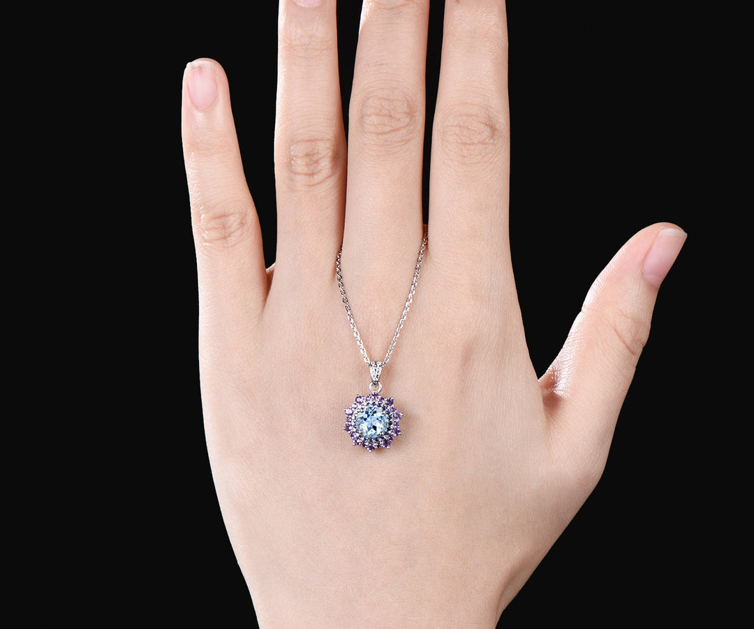 ***This stunning aquamarine necklace features a 14k rose gold chain and round aquamarine with amethyst and lab sapphire halo design, brilliant and shiny. ?Perfect for various occasions with a variety of gorgeous dresses***- Metal: Solid gold(9K/14K/18K white/yellow/rose gold),925 sterling silver, platinum available