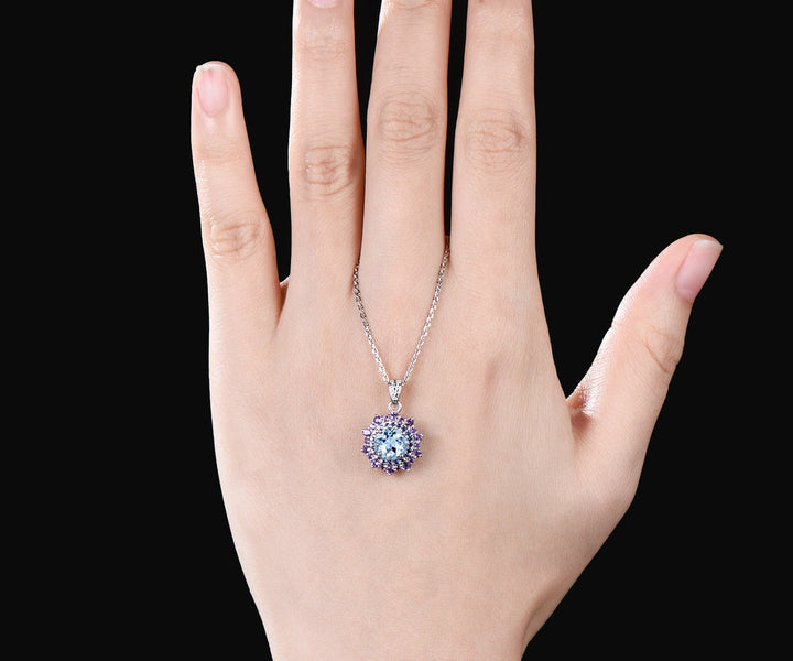 1ct round cut aquamarine necklace white gold snowdrift double halo sapphire amethyst pendant women anniversary gift jewelry