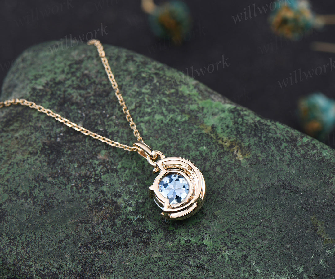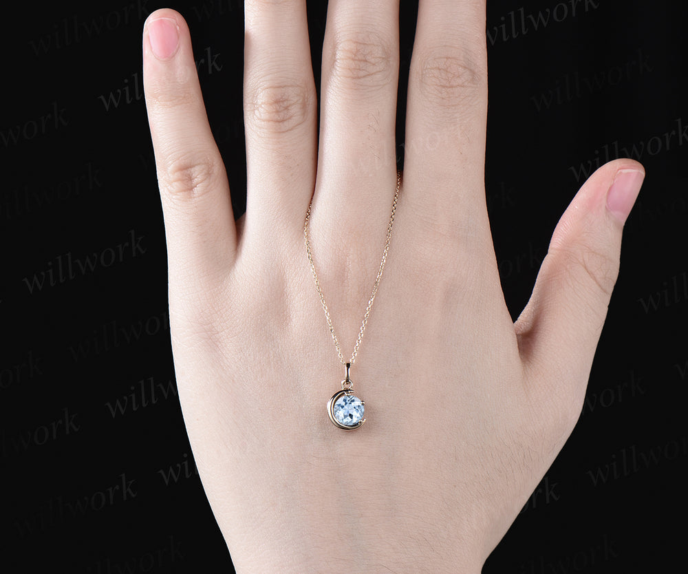 Minimalist March Birthstone Round Cut Natural Aquamarine Necklace Delicate 14k Yellow Gold Moon Pendant Solitaire Necklace Birthday Gift